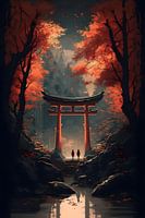 Een serene scène met een traditionele Torii poort in een levendig herfstbos. Twee figuren lopen in de richting van het gloeiende licht, omlijst door vurige rode bladeren en mistige bergen, waardoor een gevoel van vredige spirituele reis ontstaat.
