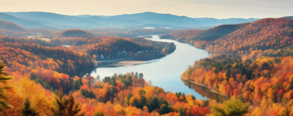 Dit weidse landschap vat de essentie van de herfst op spectaculaire wijze. Een rivier kronkelt zich een weg door een vallei die tot aan de horizon reikt, omgeven door een tapijt van bomen gekleed in herfsttinten variërend van goudgeel tot diep oranjerood.