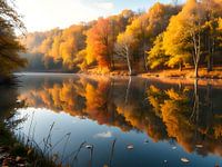 Deze foto toont een vredig herfstlandschap met een spiegelglad meer dat de heldere kleuren van de omringende bomen perfect weerspiegelt. De warme herfsttinten geel, oranje en rood contrasteren met de helderblauwe lucht en het kalme water. Zacht ochtendlicht versterkt de kleuren en de sfeer van rust. Op de voorgrond omlijsten grassen en bladeren de scène, voegen diepte toe en benadrukken de natuurlijke schoonheid van dit schilderachtige uitzicht.
