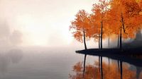 Oranjekleurige bomen worden weerspiegeld op het spiegelgladde oppervlak van een meer op een mistige ochtend. Dit vredige en kleurrijke herfsttafereel straalt rust en harmonie uit, perfect voor natuurliefhebbers en ontspannende woonruimtes.