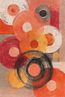 Een verzameling cirkels en ringen vult dit werk, in lagen over elkaar heen gelegd, alsof kleuren en vormen in een dans zijn vastgelegd. Rood, oranje en amber worden afgewisseld met donkere grijstinten en zachte witaccenten, waardoor de compositie diepte en ritme krijgt. De penseelstreken zijn duidelijk zichtbaar, soms ruw en energiek, soms zacht vervagend in de achtergrond.
