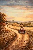 Het pad slingert rustig door gouden velden, terwijl de zachte avondzon de horizon in warme kleuren baadt. Een rode tractor rolt rustig voort, omringd door een idyllisch landschap waarin verdwaalde kuikens zich overgeven aan landelijke rust. Silo's doemen zachtjes op in de achtergrond en beloven de rijkdom van de oogst.