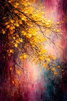 Dit adembenemende kunstwerk legt de betoverende schoonheid van de herfst vast in een fascinerend licht. Teder takjes, versierd met heldere bladeren, strekken zich gracieus uit in het beeld. De achtergrond is een fascinerende mix van warme roze tinten, diepe paarse tinten en zachte accenten die doen denken aan de zachte kleuren van een…