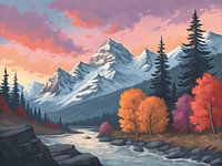 Dit levendige digitale schilderij vangt de adembenemende schoonheid van de herfst in een berglandschap. De besneeuwde toppen rijzen majestueus op in de achtergrond en hun koele tinten contrasteren prachtig met de warme tinten van het herfstbladerdak op de voorgrond. Een kronkelende rivier stroomt zachtjes door het tafereel en weerspiegelt de kleurrijke bomen en de dramatische lucht die is geschilderd met oranje, roze en paarse tinten. Groenblijvende bomen houden de wacht tussen de loofbomen en voegen diepte en textuur toe aan dit serene en schilderachtige uitzicht.