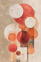 Dit werk laat een verzameling cirkels zien die in lagen over elkaar zweven, alsof ze langzaam door de lucht drijven. Warme tinten rood, oranje en amber mengen zich met zachtere crème- en beigetinten, wat een gevoel van transparantie en diepte creëert. Sommige cirkels overlappen elkaar, waardoor subtiele kleurnuances ontstaan die het werk een bijna dromerige kwaliteit geven.