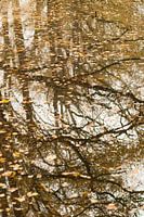 (Wassenaar/Nederland) , zag ik de weerspiegeling van de bijna kale takken in het water dat bezaaid was met afgevallen herfstbladeren. Dit leverde deze boeiende en sfeervolle herfstfoto op. Ook wel wat abstract.