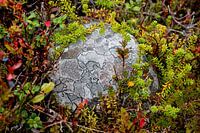 Steen in de bergen in Zweeds Lapland. Op deze kei een patroon van mosjes. Deze kei is omringd door mooie plantjes met herfstkleuren; groen, rood en geel.