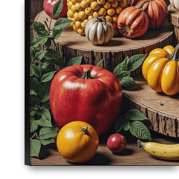 Een stilleven met verschillende herfstvruchten en -groenten, waaronder pompoenen, kalebassen, appels en aardbeien, uitgestald op houten stronken en een tafel. Een gedessineerde kruik staat centraal tussen de producten.