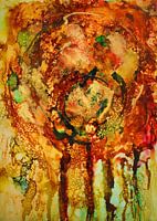 De herfststormen beginnen. De wind raast in het rond. De blaadjes zitten nog aan de bomen maar nog even en dan vallen zij op de grond. Een abstracte impressie van de stormen geschilderd met alcohol inkt in warme bruinrode en gouden kleuren.