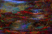 De afbeelding toont een fascinerende, abstracte wereld waarin krachtige kleuren zoals rood, blauw en goud zich vermengen tot een wervelende chaos van licht en beweging. Het doet denken aan een stromende stroom of een galactisch landschap dat zowel dynamisch als diepgaand is.