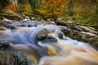 Deze foto vangt de magie van de herfst op een perfect moment. De compositie combineert de dynamische beweging van een snelstromende beek met de rijke, warme kleuren van een bos in volle glorie.