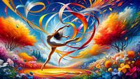 In de veertiende afbeelding is een danseres afgebeeld in een poëtische dansbeweging, ingebed in een herfstlandschap vol levendige kleuren en bloemenpracht. De gele, oranje en rode tinten van de lucht en de vegetatie smelten samen tot een symfonie van kleur die tot leven lijkt te komen door de beweging van de danser. Deze compositie is…