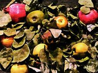 Een tentoonstelling van herfstfruit op een bed van hun drogende bladeren, gevonden in Umbrië, Italië. Het fruit bestaat uit groene appels, kweeperen en rode granaatappels, allemaal Italiaanse hoofdbestanddelen in de herfst. Een mooie display voor een keuken.