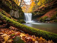 Een betoverde plek in het herfstige bos, kleurrijke herfstbladeren, een met mos begroeide boomstam een sprookjesachte waterval. Idylle, natuur en rust. Men hoort alleen het stromende water dat over de rotsen naar beneden valt. Een prachtige lange belichting met een herfstige sfeer.