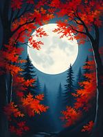 Een sereen digitaal schilderij dat de magie van een nacht met volle maan in een herfstbos vastlegt. Levendige rode en oranje bladeren omlijsten een heldere volle maan, die een zachte gloed werpt op de schaduwrijke groenblijvende bomen en de donkere bosgrond eronder. Het contrast tussen het warme gebladerte en het koele maanlicht creëert een betoverende en rustige scène.