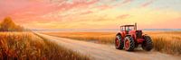 De lucht straalt in zachte pastelkleuren, terwijl een felrode tractor trots op een stoffig pad staat. De gouden velden wiegen zachtjes in de avondbries en de sfeer is vervuld van de stille magie van de landelijke idylle. Een moment waarop de tijd lijkt stil te staan om de schoonheid van de natuur te eren.