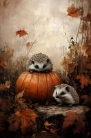 Een kleine egel zit naast een pompoen tussen de herfstbladeren. De warme tinten en zachte details geven dit werk een knusse en sfeervolle uitstraling. Dit werk maakt deel uit van de serie Herfstvriendjes, waarin dieren en herfstdetails samenkomen in sfeervolle taferelen.