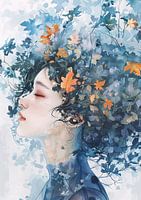 Details: vrouw, herfst, bladeren, natuur, surrealistisch, vrouwelijk, etherisch, serene, blauw, oranje