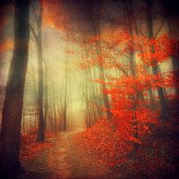 Bospad met loofbomen met vurige rode bladeren - bewerkte foto bewerkt met textuur overlays