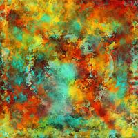Autumn Fire" is een levendig digitaal abstract werk met veel contrast en textuur. De heldere, contrasterende turquoise, oranje, gele en groene tinten, die doen denken aan tie-dye, stralen vanuit het midden naar buiten, hinten hier en daar naar patronen en verbergen half een obscuur symbool. De heldere warme en koele kleuren doen…