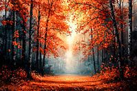 Dit schilderij brengt je naar een rustige herfstdag in een betoverend bos. De bomen zijn versierd met vurige oranje en rode bladeren die in de lucht dansen, terwijl de bodem bedekt is met een prachtig tapijt van gevallen bladeren. De subtiele mist in de achtergrond geeft een dromerige sfeer aan het landschap, waardoor het een rustige en serene uitstraling heeft. Dit kunstwerk is perfect voor wie van natuur en seizoensgebonden schoonheid houdt. Het roept gevoelens van rust, verwondering en het verstrijken van de tijd op. Dit schilderij is ideaal om je ruimte te verfraaien en een warm herfstgevoel te creëren, het hele jaar door.