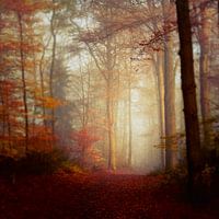 Loofbos op een mistige herfstochtend bij zonsopgang. Foto bewerkt met textuur overlays. Randonscherpte is opzettelijk!