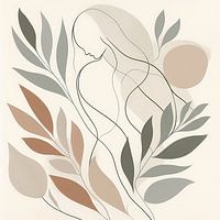 Een vrouw met gesloten ogen, omringd door vloeiende lijnen en delicate bladeren - kalm, waardig, dicht bij de natuur.