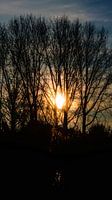 Een zwakke, vale laagstaande herfstzon schijnt tussen de dunne bewolking door de takken van kale bomen en maakt van de bomen op de voorgrond mooie silhouetten, als dansers die naar de lucht reiken. Het is ver in de herfst, de zon staat laag aan de hemel en komt niet meer boven de bomen uit. Deze foto geeft een najaarsgevoel, van korte dagen en lange nachten voordat de dagen vier weken later weer langzaam beginnen te lengen. Op de voorgrond is nog de reflectie van de zon in het water van de Gorssloot in Purmerend te zien.