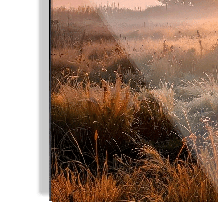 Een schilderachtige zonsopgang baadt het landschap in gouden licht. Zachte mist ligt over de velden en verleent het tafereel een mysterieuze sfeer. Op de voorgrond gloeien grassen en herfstbloemen in warme kleuren, terwijl bomen de horizon sieren. Een rustig moment vol vrede en schoonheid.