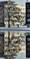 Modern apartementengebouw gereflecteerd in een bijna bevroren gracht met het lage winterlicht op de zijkant van het gebouw.