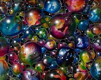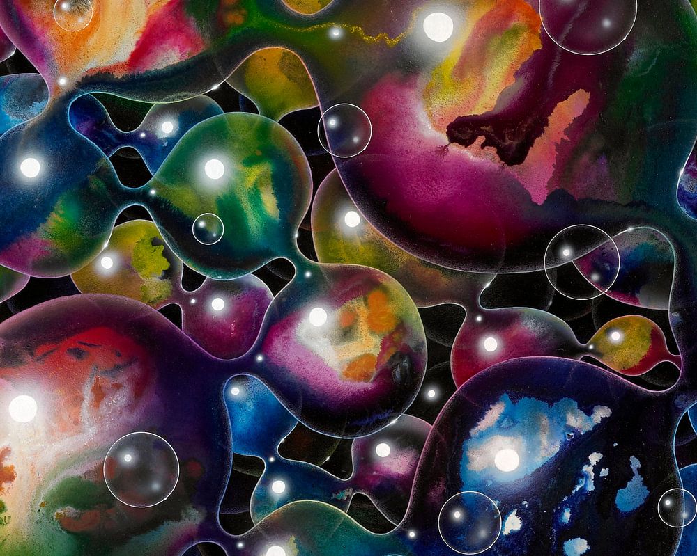 Het abstracte beeld toont verschillend gevulde, onderling verbonden kleurrijke en transparante bellenstructuren.