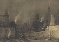 Donkere plaat met schoorstenen, rook en andere fabrieksgebouwen door de hand van de specialist van het vastleggen van Nederlands' industrie.