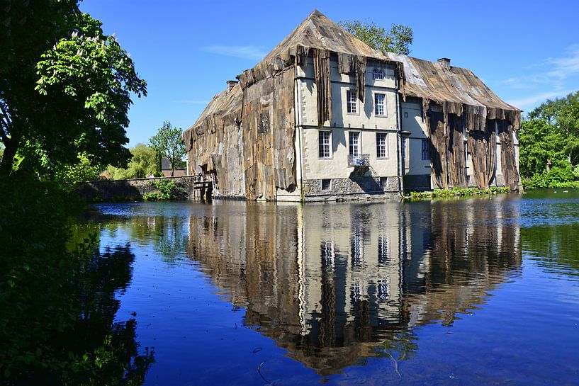 Schloss Strünkede in Herne. Als Kunstwerk mit Kohlensäcken verkleidet zum Ende des Bergbaus in diesem Jahr
