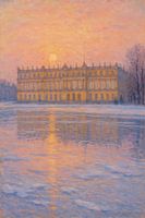 Als de winterzon achter de horizon zakt, straalt het paleis aan de Herrenchiemsee met een stille majesteit. Zijn grootse gevel weerspiegelt in het bevroren meer beneden, waar zachte rimpelingen van goud en roos door het bleke ijs glinsteren. De hele scène voelt zwevend in het licht - alsof de tijd zelf is vertraagd om dit moment van…