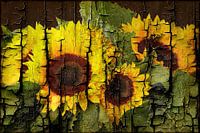Grote Zonnebloemen geprojecteerd op verbrand hout, digitaal bewerkt.