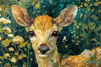 Details: hert, bloemen, natuur, kleurrijk, geel, groen, bruin, ogen, fauna, flora