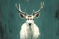 Dit kunstwerk toont een wit hert met indrukwekkend gewei, afgebeeld tegen een egaal, diepgroene achtergrond met subtiele textuur. De directe blik van het dier straalt kalmte en waardigheid uit, terwijl de schilderachtige stijl een bijna spirituele zachtheid toevoegt aan de compositie. De contrasten tussen het lichte dier en de donkere achtergrond creëren een visueel evenwicht dat rust en kracht combineert. Perfect voor een stijlvol interieur met natuurlijke of Scandinavische accenten, waar eenvoud en elegantie samenkomen.