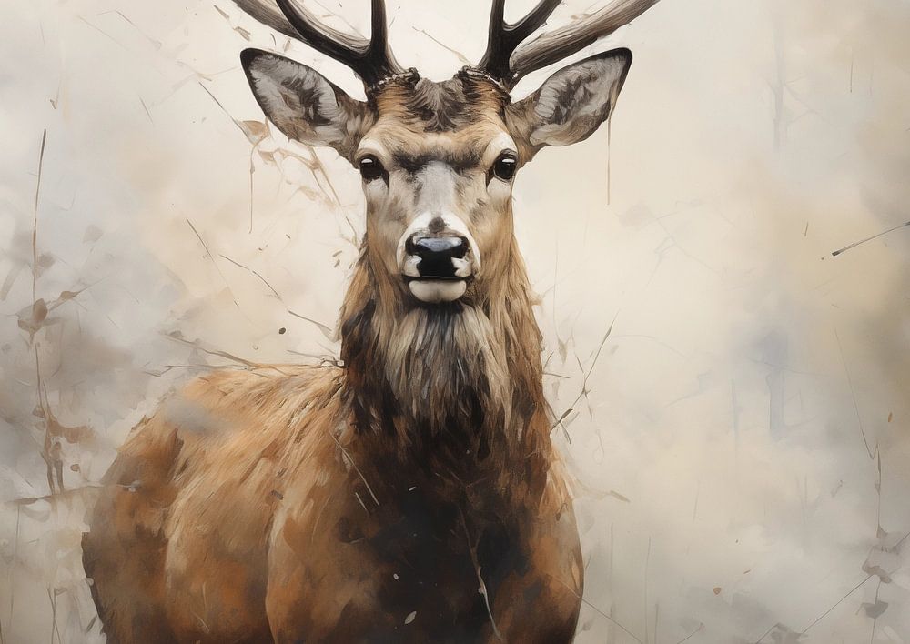 Op het canvas schittert een majestueus hert, gekroond met een indrukwekkend gewei. De gespierde gestalte straalt kracht uit, terwijl de ogen een blik van serene vastberadenheid dragen. Het gewei, als een kroon van de natuur, vertakt zich in symmetrische pracht, als een eerbetoon aan de volharding van dit dier. Zijn imposante aanwezigheid vult de ruimte met een gevoel van grootsheid en eerbied. Dit schilderij roept een gevoel van harmonie op tussen de ruige wildernis en de gracieuze waardigheid van het hert.