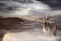 Een hert aan zee met een vlaag mist , omgeven en bekeken door een zeemeeuw.