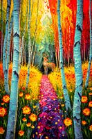 Hert en Berken: Een Pad door Magie is een kleurrijk en betoverend kunstwerk dat de serene schoonheid van de natuur vastlegt in een explosie van warme tinten en magische details. In een schilderachtig bos van berkenbomen slingert een pad van levendige bladeren en bloemen naar een centraal punt, waar een majestueus hert als bewaker van deze magische wereld staat. De kleurrijke bomen en het stralende licht dat door het bladerdak valt, wekken een gevoel van mysterie en rust op.