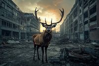 Een hert staat rustig in een gebied dat lijkt te zijn vergeten door de tijd. Rondom hem zijn oude, verlaten gebouwen te zien die ooit druk waren, maar nu leeg en stil zijn. Het hert kijkt direct naar de camera met nieuwsgierige ogen, als om te vragen: "Wat doe jij hier?" De combinatie van het wilde dier en de verlaten omgeving creëert een bijzondere sfeer. De natuur heeft langzaam zijn gang kunnen gaan in deze vergeten ruimte, terwijl het hert centraal staat in dit verrassende tafereel. Het contrast tussen de levendigheid van het hert en de verlatenheid van de gebouwen maakt deze afbeelding uniek en intrigerend.