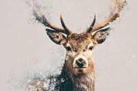 Deze intrigerende compositie toont een majestueus hert in een creatieve digitale stijl waarbij delen van zijn lichaam en gewei oplossen in een wervelende explosie van sneeuw en textuur. De zachte kleuren, gecombineerd met het krachtige oogcontact van het dier, creëren een balans tussen rust en dynamiek. Het beeld voelt als een ontmoeting tussen natuur en verbeelding — perfect voor wie houdt van moderne winterkunst met symboliek en mystiek.