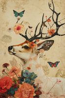 "Hert in Bloemenparadijs" toont een sierlijk hert omgeven door een weelderige bloemenpracht en dansende vlinders. De delicate bloemen in warme tinten van rood, oranje en roze sieren het gewei van het hert en creëren een harmonieuze en betoverende compositie. Vlinders in levendige kleuren fladderen speels rond, wat een gevoel van vreugde en natuurpracht toevoegt. De zachte, aardse achtergrondkleuren versterken de serene en magische sfeer van het kunstwerk. Dit stuk is perfect voor liefhebbers van natuur, dieren en botanische kunst, en brengt een vleugje elegantie en natuurlijke schoonheid in elke ruimte.