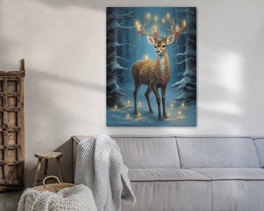 Deze betoverende foto brengt de magie van Kerstmis tot leven met een majestueus hert dat schittert in een feestelijke groene en oranje omgeving. Dit kunstwerk past perfect in een kerstachtig, gezellig interieur en brengt de warmte en vreugde van de feestdagen in huis. De blauwe en oranje tinten voegen een vleugje kerstsfeer toe aan elke ruimte en roepen een gevoel van betovering op.