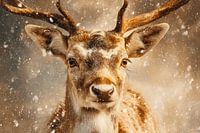 Deze betoverende close-up toont een hert met imposant gewei, badend in warme goud- en bruintinten terwijl sneeuwvlokken zacht naar beneden dwarrelen. De realistische textuur van zijn vacht en de intense, rustige blik creëren een gevoel van kalmte en verwondering. De subtiele lichtval en zachte achtergrond maken dit beeld ideaal voor winterse decoratie met een natuurlijk, sereen karakter.