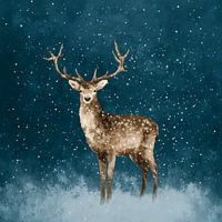 Dit schilderachtige kunstwerk toont een trots hert dat sereen in een winterlandschap staat, omgeven door zachte sneeuwvlokken tegen een diepblauwe achtergrond. De illustratieve stijl, met een aquareleffect en subtiele textuur, brengt een gevoel van rust en verstilling over. Het hert straalt kracht en elegantie uit, terwijl de omgeving…