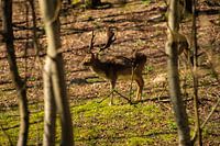 hert in de lente zon staand tussen de bomen in de waterleidingduinen langs de Nederlandse kust.