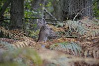 De bovenkant van een hert in het bos dat door zijn donkere kleur bijna over het hoofd gezien kan worden. En als je nog even goed kijkt dan zie van een ander damhert alleen de rug. Dit werd ontdekt toen ik de foto ging bekijken.