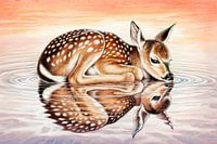 Dit prachtige kunstwerk vangt de serene schoonheid van een jong hertje dat zich in het water weerspiegelt. De combinatie van hyperrealistische details en zachte aquarelkleuren maakt het een betoverend stuk dat rust en verfijning uitstraalt. De subtiele golven in het water en de warme tinten van de zonsondergang voegen een dromerige sfeer toe. Perfect voor liefhebbers van natuurkunst en dierenportretten. Dit ontwerp is een stijlvolle toevoeging aan diverse interieurs, zoals een slaapkamer of kantoor, waar het een kalmerend en elegant accent biedt. Met zijn gedetailleerde afwerking en levendige uitstraling is het een echte blikvanger die blijft fascineren.