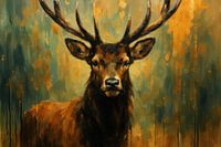 Een koninklijk hert met imposant gewei staat centraal, opgebouwd uit brede penseelstreken en subtiele verfdrupsels. De achtergrond mengt koel groenblauw met warme oker- en goudtinten, waardoor diepte en contrast ontstaan. Het scherpe dierenportret en de organische texturen geven een levendige, natuurlijke uitstraling. Zachte lichtval…